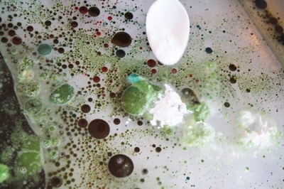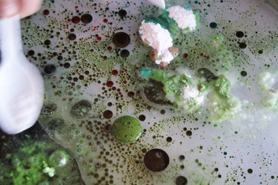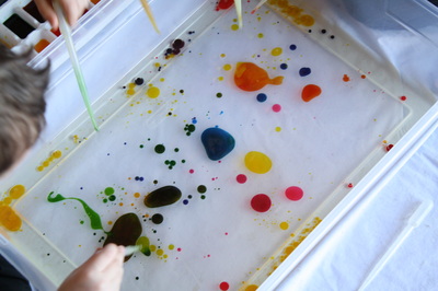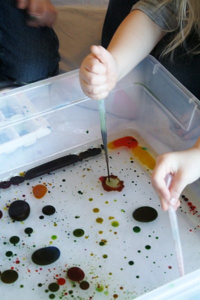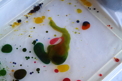 Today we had fun with this science activity from Growing A Jeweled Rose. We started out with a tub of oil and first we added colored water. The kids loved how the colors made "bubbles" in the oil and they even discovered that they could mix colors within the color bubbles.