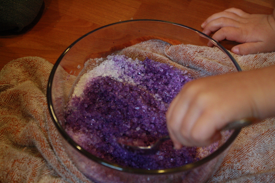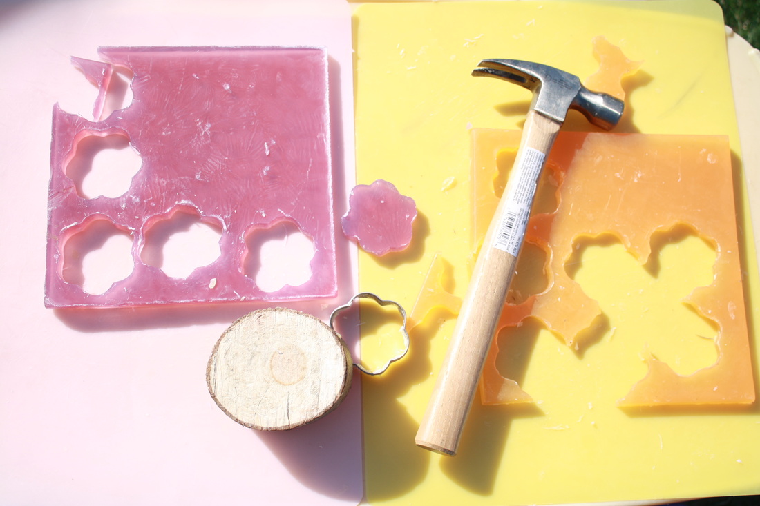 I'm a little behind, but have been wanting to share what we did for Mother's Day this year! I think the kids really had a lot of fun with it, and so did I! Together as a group, we mixed up our own bath salts to give to mom... in both lavender and chocolate scents! I got the "recipe" here. Whether making them or using them, bath salts are a great sensory activity for kids! A great texture, and so many scent possibilities! We also made our own soaps. The kids loaded a bowl full of glycerin soap bars, and I melted them down in the microwave. Then they added lavender scent and the colors of their choice. After it had cooled and set, the really fun part started! The kids used cookie cutters, a wood block, and a hammer to pound out flower and leaf shaped soaps! I hope the moms enjoy their gifts as much as we enjoyed the process of making them! :)