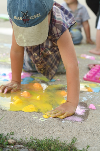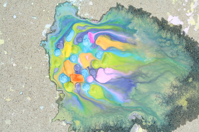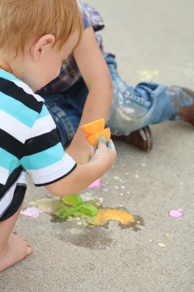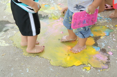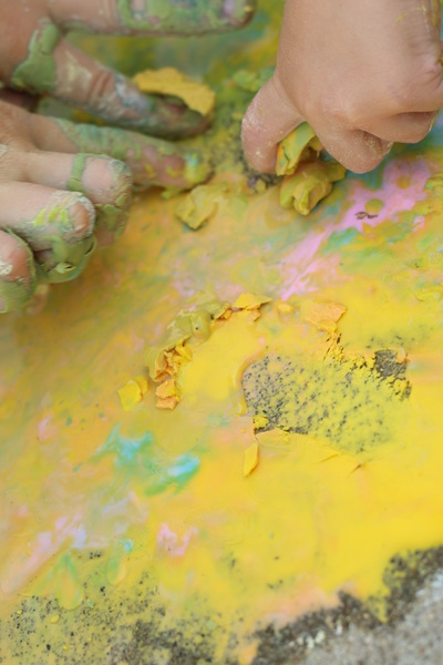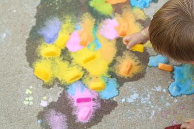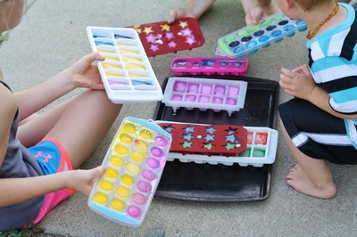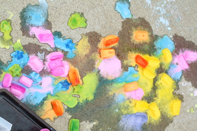 Chalk paint was a big hit yesterday! Equal parts cornstarch and water, with food coloring or liquid watercolor mixed in, then frozen. The kids had fun using them as chalk, and then even more fun when they discovered that as it melted, it made oobleck...one of our favorite sensory materials! They loved watching the colors swirl and run together as it melted.