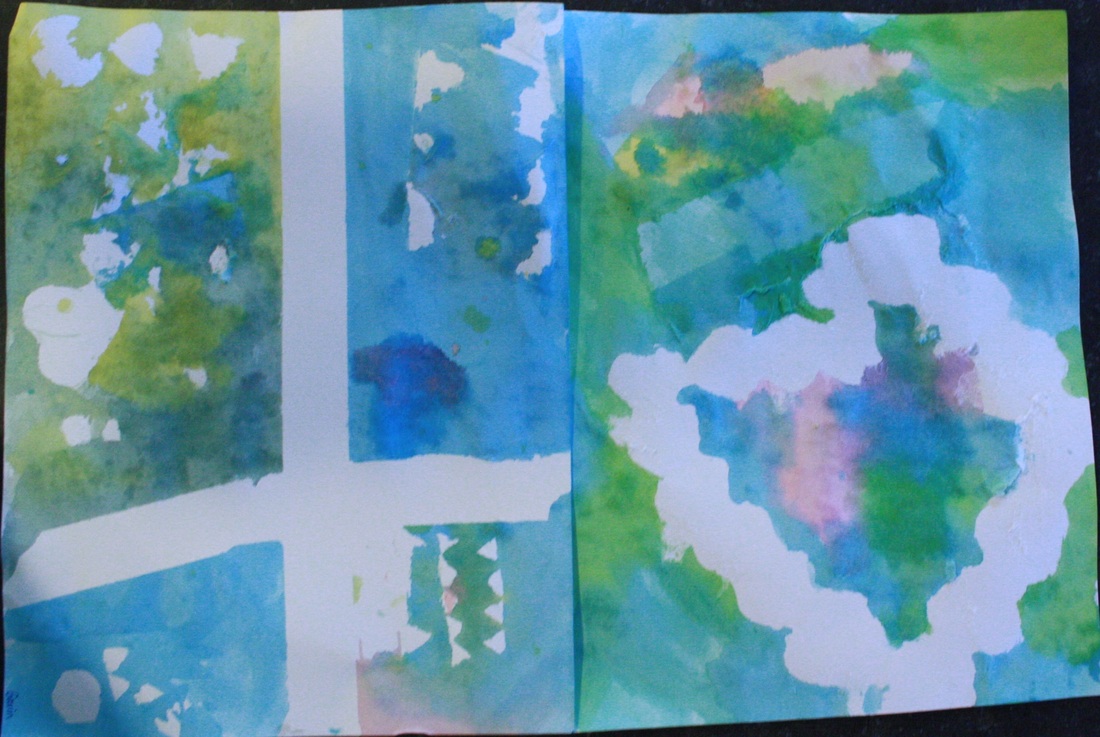 Today we used painter's tape and foam stickers to create some resist paintings. The kids made pictures, letters, and designs using the tape and stickers (and worked really hard at peeling the backs off the stickers and learning how to rip the tape off the roll - great fine motor work!), and then used watercolors to paint around their designs. Once they were done painting, most of the kids peeled off all of their designs to see the picture that it left underneath!
