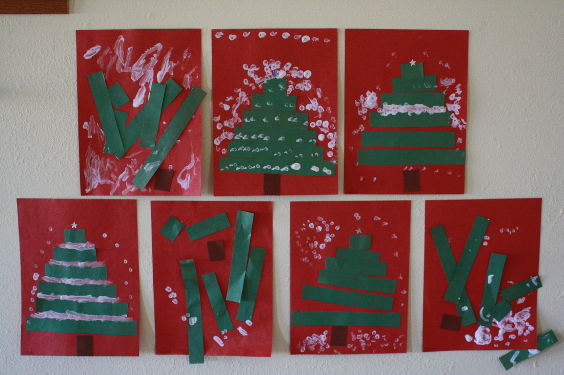 I'm back! The new baby and I are, so far, adjusting well to merging our days with all the other kids... I'm glad to report that the first couple of days back have gone really well! Today the kids made some festive trees using strips of green paper cut to varying lengths. It was great practice using the pre-math skill of judging biggest to smallest, as they had to compare the rectangular strips to get them in the right order to make a tree shape. They also had to use their visual-spacial and visual planning skills to lay the strips in a way that would allow them to fit the whole tree onto their paper. Of course, for the younger ones we didn't worry so much about those things, and instead let them focus on the fine motor skills of picking up the papers, applying glue, and placing them down to make a much more "abstract" tree! :) We then placed a foil star sticker at the top and used some Q-tips dipped in white paint to add some snowflakes!